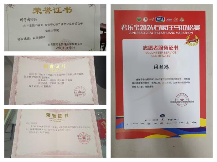 在学习之余,我也积极参加志愿服务活动,注重实践能力的培养,参与了2024年石家庄市马拉松志愿者等社会实践活动。并投入河北外国语学院的建设中,对校园的环境进行呵护、对校内同学互帮互助,积极响应学校的号召。