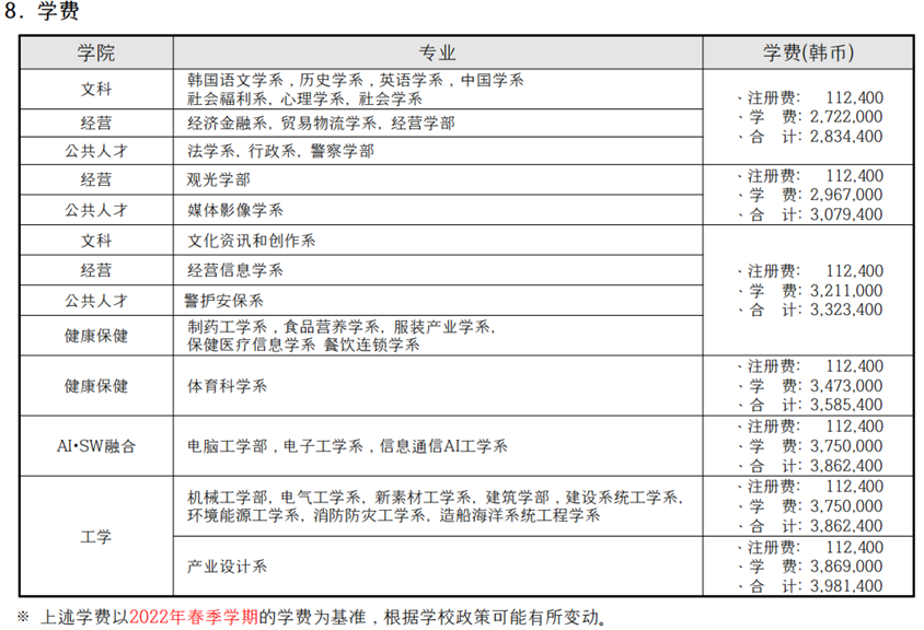 韩国庆南大学学费按学院及专业有所不同,均包含注册费与学费两项。例如,部分专业合计费用分别为2,834,400韩元、3,079,400韩元、3,323,400韩元、3,585,400韩元及3,862,400韩元等不同档次。以上学费为参考标准,具体金额请以庆南大学官方最新发布的学费信息为准。