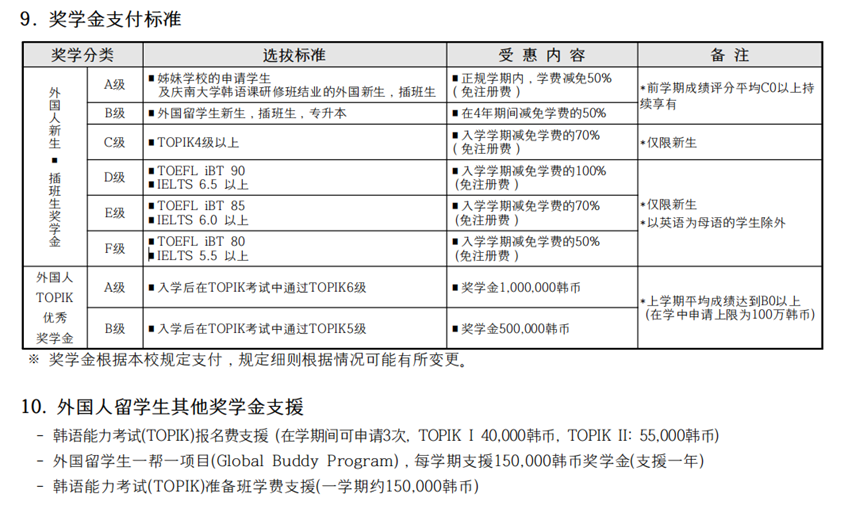 A级奖学金减免50%学费(免注册费),B级减免50%学费,C级(TOPIK 4级及以上)减免70%学费(免注册费)等。外国人 TOPIK优秀奖学金:A级:入学后在TOPIK考试中通过TOPIK6级奖励奖学金1,000,000韩币,B级:入学后在TOPIK考试中通过TOPIK5级 奖励奖学金500,000韩币