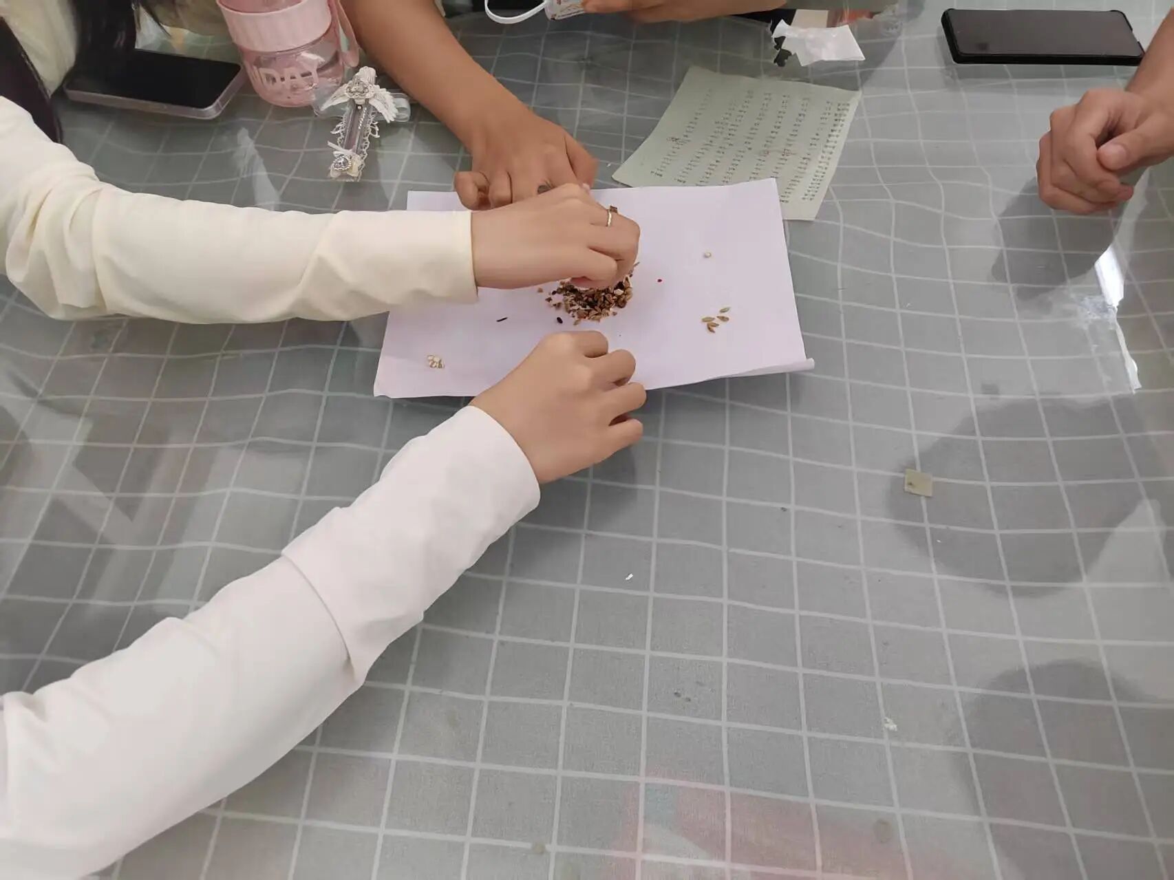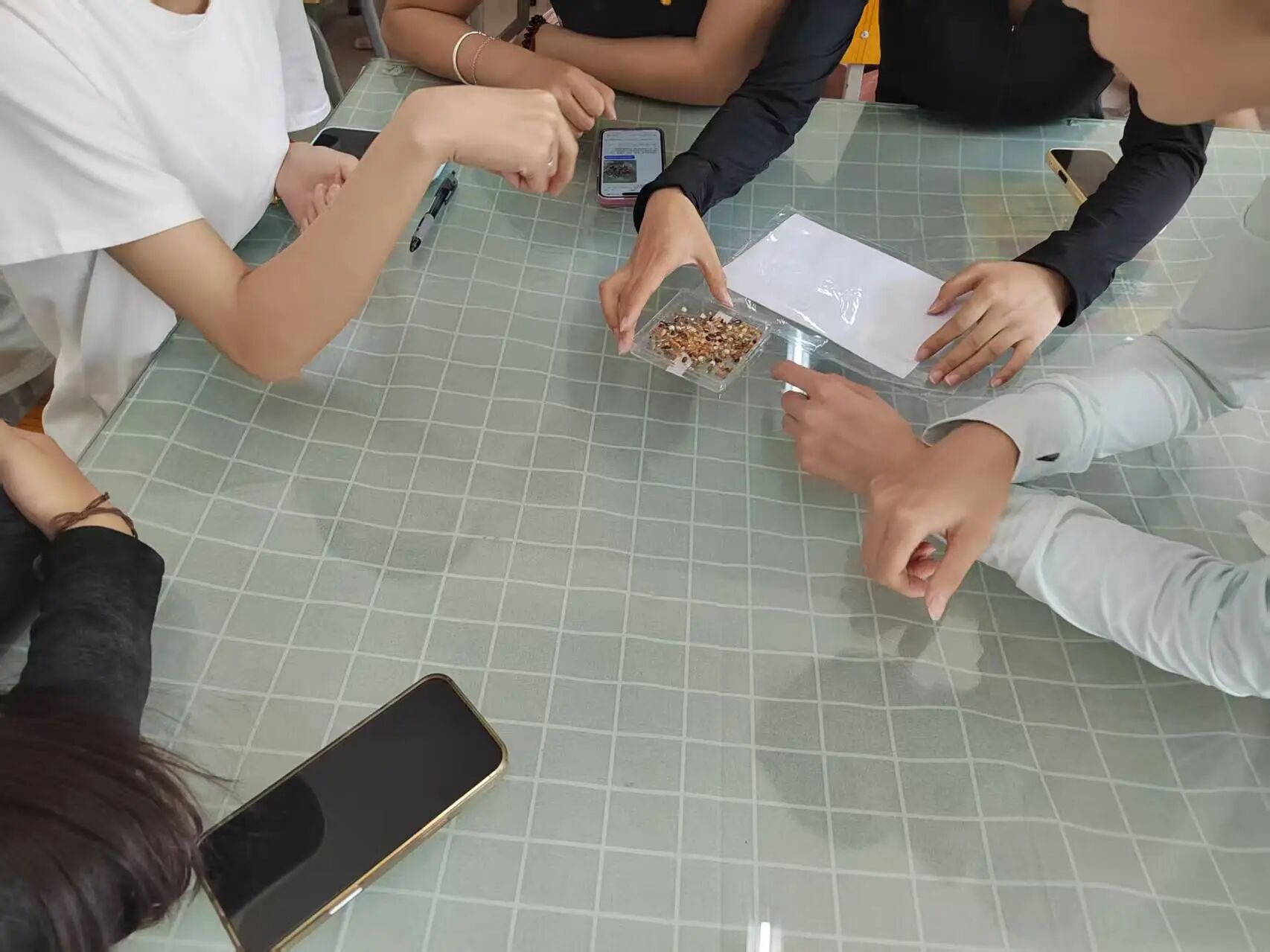 在实践环节,同学们分成小组,围绕在药材桌前,在教师的指导下进行中药识别与分类。老师一边展示药材,一边详细讲解其形态特征、药用功效和鉴别方法。同学们认真聆听,仔细观察药材的形状、颜色、纹理,并用手触摸感受药材的质地,有的同学还轻轻闻嗅药材的气味,通过多感官体验来加深对药材的认识。