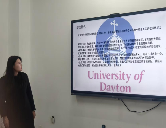 宣讲会上,韩佳尊围绕代顿大学的核心优势展开详细讲解。她介绍,代顿大学是一所美国私立大学,同时也是俄亥俄州最大的私立学校,在2025年US NEWS全美综合排名中位列第136位,本科生新生保有率高达90.8%,位列全美学生满意度前十,校园环境更是入选全美最著名校园地标,拥有11英亩绿地、8英亩太阳能草原及近60栋特色建筑,学习生活氛围极佳。