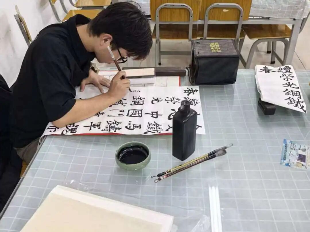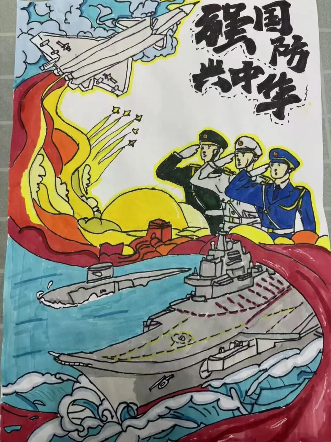在成果展示环节,书法作品或苍劲有力、或飘逸洒脱,展现了“精忠报国”“山河无恙”等爱国主题;绘画作品色彩饱满、构思新颖,既有再现革命历史场景的油画,也有展现新时代国防力量的水彩与漫画。一幅幅作品不仅是艺术的表达,更是青年学子国防情怀的生动写照。