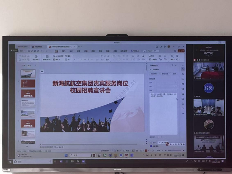 当日上午,新海航天津航空负责人白经理通过腾讯会议开展宣讲,详解企业发展概况——新海航天津航空安全运营16年,拥有A330、A320、E190机队等在册飞机107架,安全飞行超过300万小时。同时,白经理围绕贵宾接待岗位的职责、福利、面试要求及晋升路径展开解读,并现场回应学子疑问。