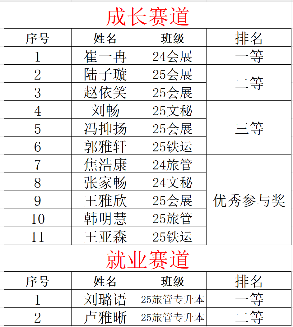 本次院赛设置成长赛道与就业赛道,覆盖会展经济与管理、旅游管理、铁道交通、现代文秘等多个专业领域。为助力选手打磨优质作品、提升竞技水平,学院赛前精心筹备系列赋能活动:组织职业规划经验分享会,推荐优秀指导教师提供一对一专业指导;25旅管专接本班赵林峰同学主动分享参赛经验,耐心指导同学们优化方案、补齐短板,为大赛顺利开展奠定坚实基础。