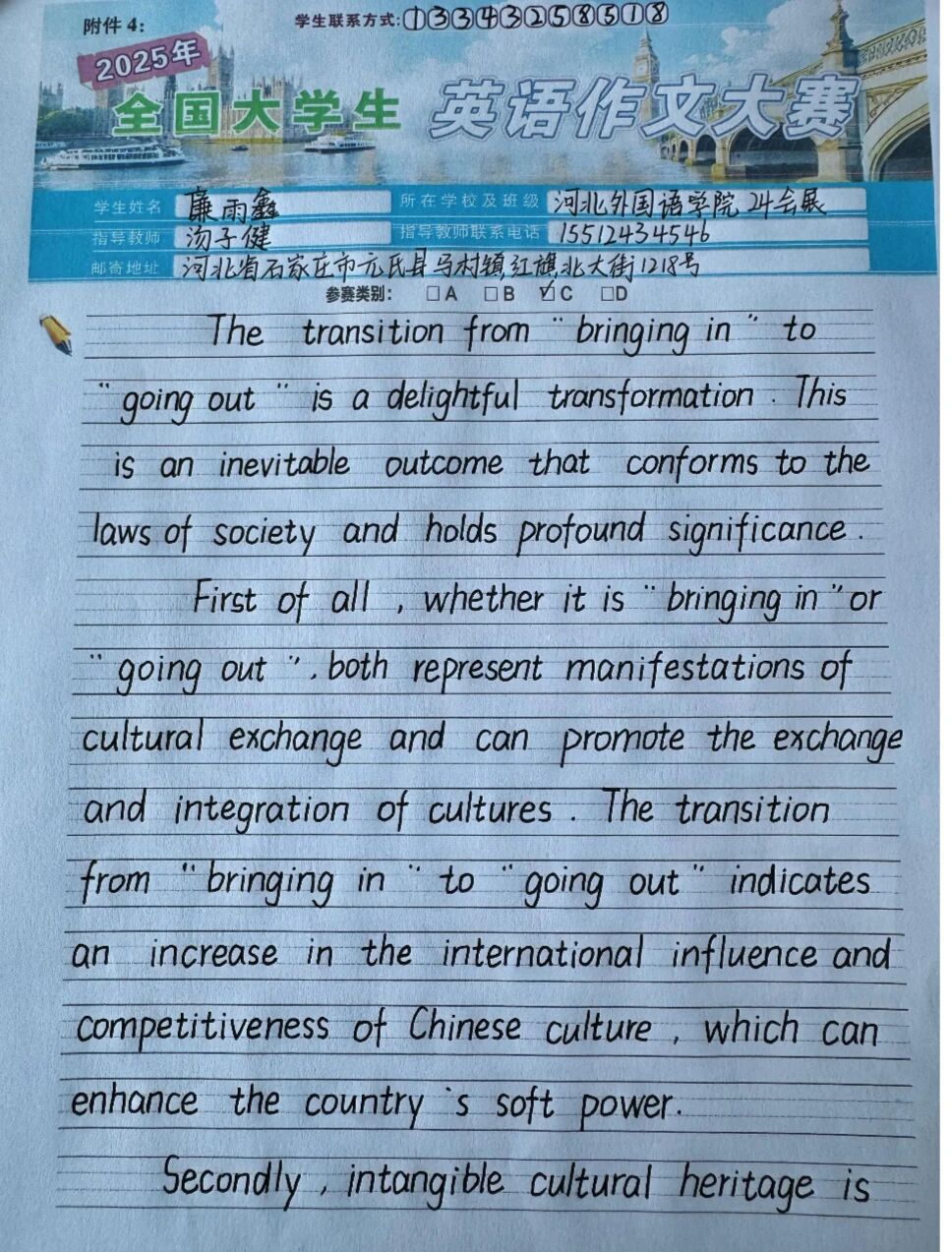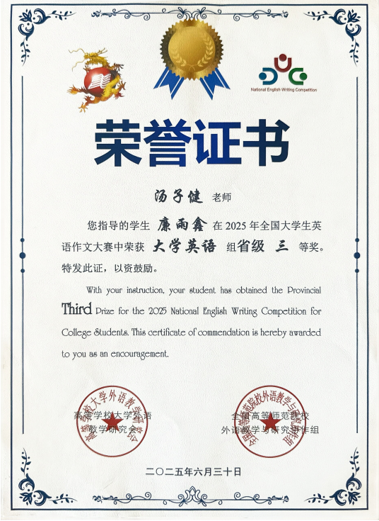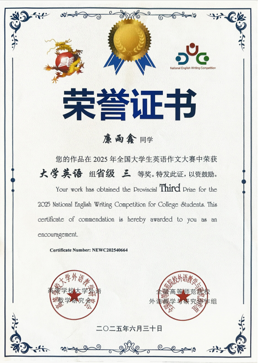 全国大学生英语作文大赛作为英语学科领域极具影响力的赛事,吸引了全国众多高校学子踊跃参与。赛事以提升学生英语写作水平、促进跨校语言交流为目标,通过层层选拔,检验学生英语综合运用能力。在激烈竞争中,廉雨鑫同学在指导教师汤子健的专业助力下,从海量参赛者中突围。备赛期间,她深耕英语写作技巧,打磨文字逻辑,以扎实的语言功底、清晰且富有创意的写作思路,历经初赛、复赛等环节,最终脱颖而出。