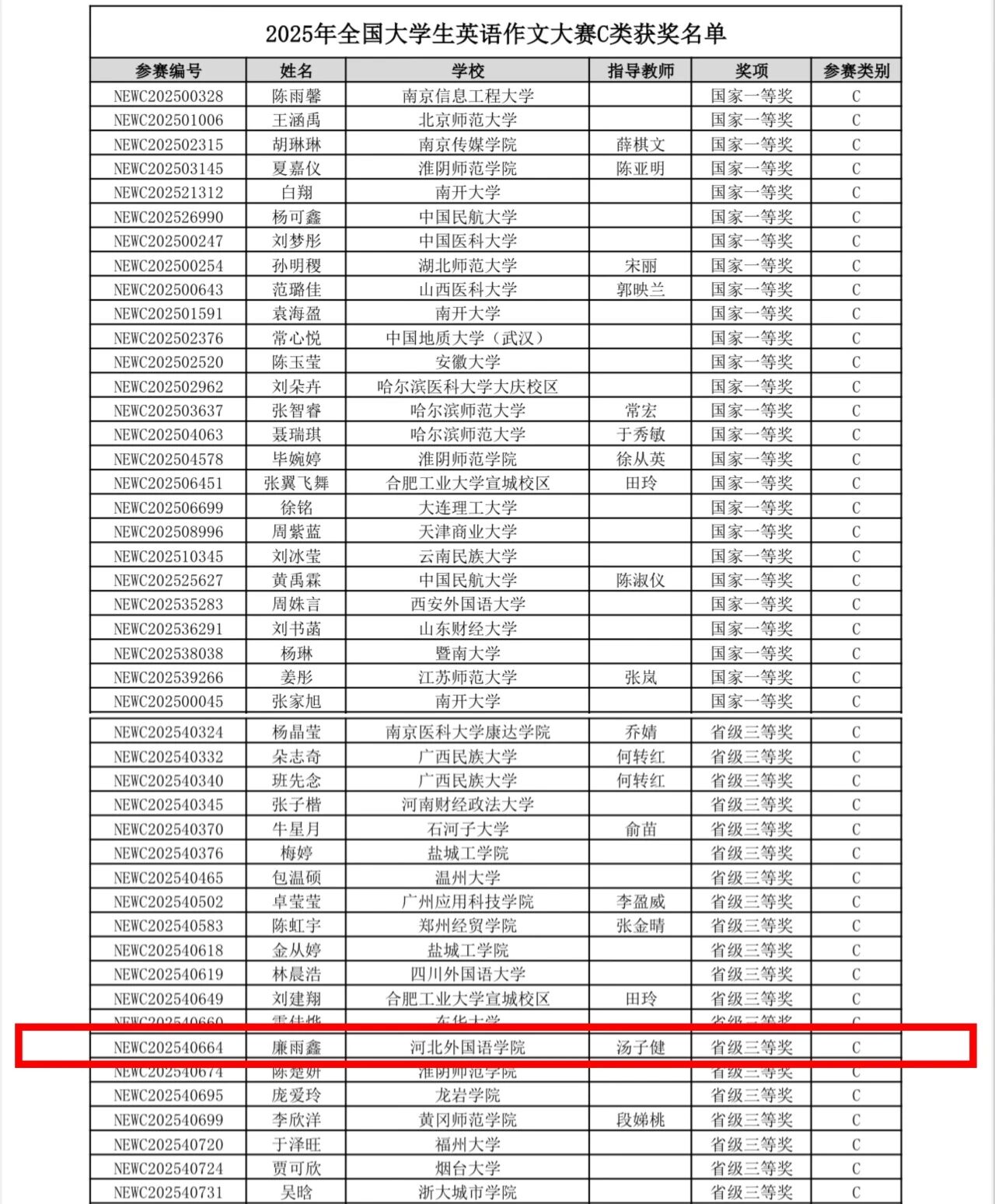 近日,2025年全国大学生英语作文大赛获奖名单正式公布,同时,荣誉证书已邮寄到校。河北外国语学院国际航空旅游学院传来喜讯:我校学子廉雨鑫在赛事中凭借优异表现,荣获C类省级三等奖,为学校增添荣誉!