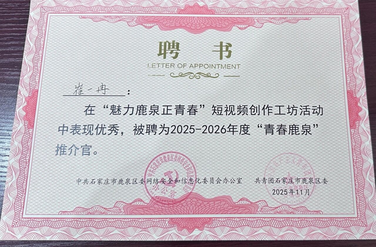 近日,河北外国语学院国际航空旅游学院学生崔一冉凭借出色的创作表现,在石家庄市鹿泉区“魅力鹿泉正青春”短视频创作工坊活动中斩获佳绩,被中共石家庄市鹿泉区委网信办、共青团石家庄市鹿泉区委联合聘任为2025-2026年度“青春鹿泉”推介官,相关聘书在“智汇鹿泉·青创领航”创新创业交流营结业暨青年创业大赛决赛活动现场正式颁发。