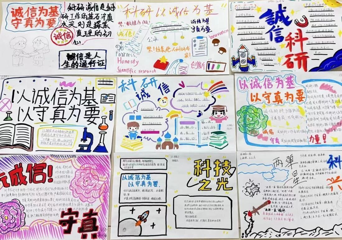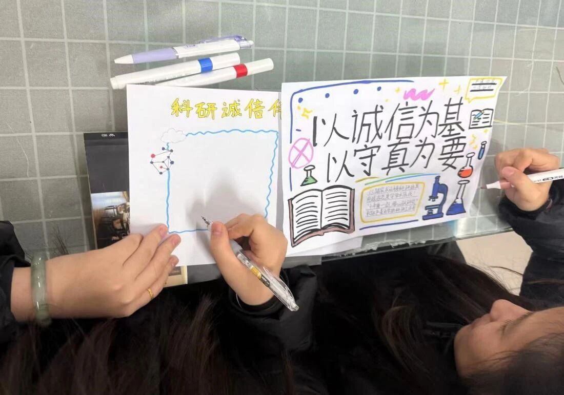 活动过程中,每个同学围绕科研诚信典型案例,通过手绘海报的方式,结合学术不端反面事例、严谨治学正面榜样进行创作,同学们从主题契合度、创意表现、内容准确性三方面对作品进行绘制。同样也设置了小组交流分享环节,新生们在创作与讨论中深入理解科研诚信的重要性,进一步树立“以诚信为基、以守真为要”的学术理念。
