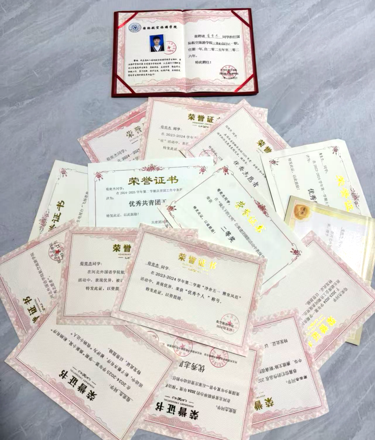 大家好,我是荀奕杰,2025年国家励志奖学金获得者,担任23空本一班班长,军训内务副辅导员,公寓建团副书记,在校期间我积极响应学院号召,参加各项活动,并取得了一些荣誉,如: “军训个人标兵”,“河北省侨联优秀志愿者”,“优秀共青团干部”,“亲情中华,中国寻根之旅优秀志愿者”等一系列荣誉。