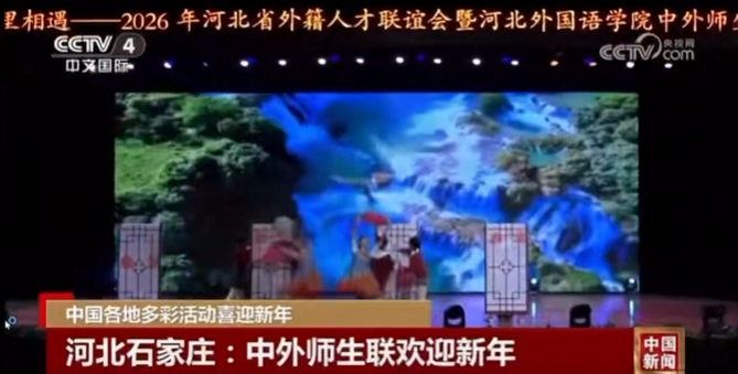 2025年12月31日,“世界在这里相遇——2026年河北省外国专家联谊活动暨河北外国语学院中外师生元旦晚会”成功举办,国际航空文旅学院外籍专家恩迪、阿卜杜作为大合唱一员出演此次晚会,本次晚会成功举办标志着河北外国语学院作为中外人文交流的重要平台,在辞旧迎新之际,为在冀外国专家与学院师生搭建了友谊桥梁,谱写了国际文化交流的新篇章。