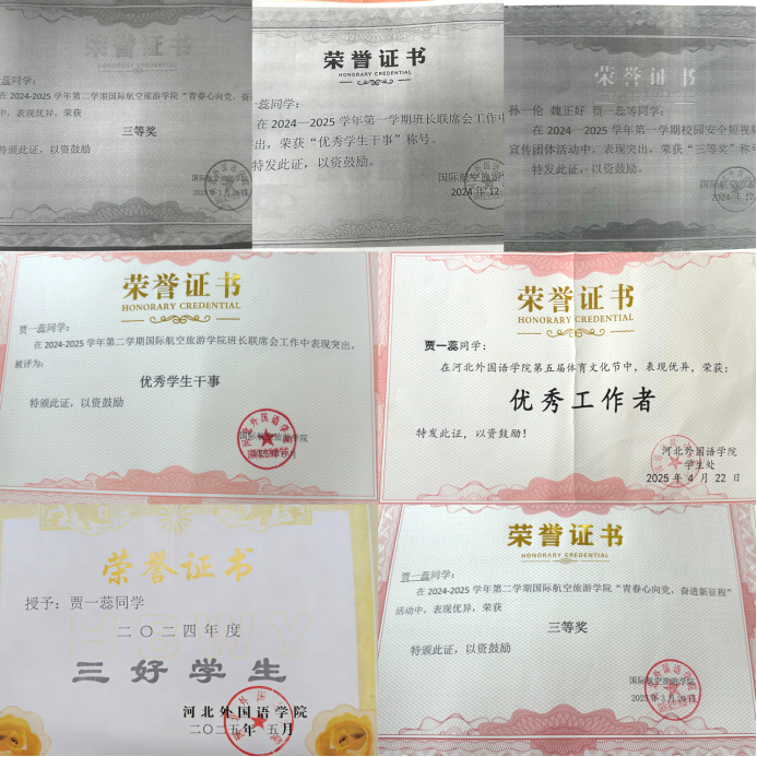大家好!我是贾一蕊,现就读于河北外国语学院国际航空文旅学院空中乘务专业,目前担任24级空乘班班长一职、班长联席会信息部干事,作为一名共青团员,我始终以高标准严格要求自己,在学习、工作与社会实践中全面发展,绽放青春光彩。